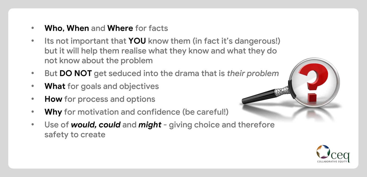 Of our 6 open questions, each has its own unique purpose. ‘Who’, ‘when’ and ‘where’ are often looking for facts so we can stretch the other person to consider other factual data. However we should be wary of asking these 3 questions as the risk is that we will get seduced into the drama that is their problem and end up inevitably offering solutions.